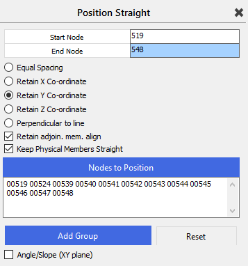 Angle/Slope (XY Plane) check box - Alternatively to positioning selected nodes on a straight line between two nodes, they can be placed at a defined angle or slope ratio. This function only operates in the XY plane. Using this function