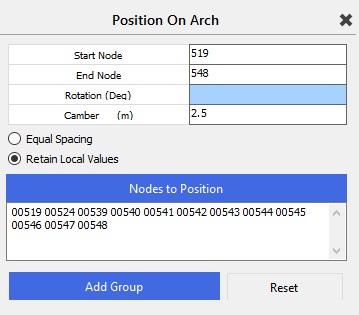 This function enables you to position a selected set of existing nodes on an arch, defined by start and end nodes, an arch height (camber), and a rotation angle for plane of the arch from the vertical axis.