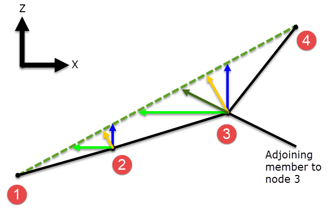 Retain adjoining member alignment – If say node 3 had an adjoining member whose projection intersected with the straight line, then the node would move in the axis of this member (dark green arrow) to the straight line.