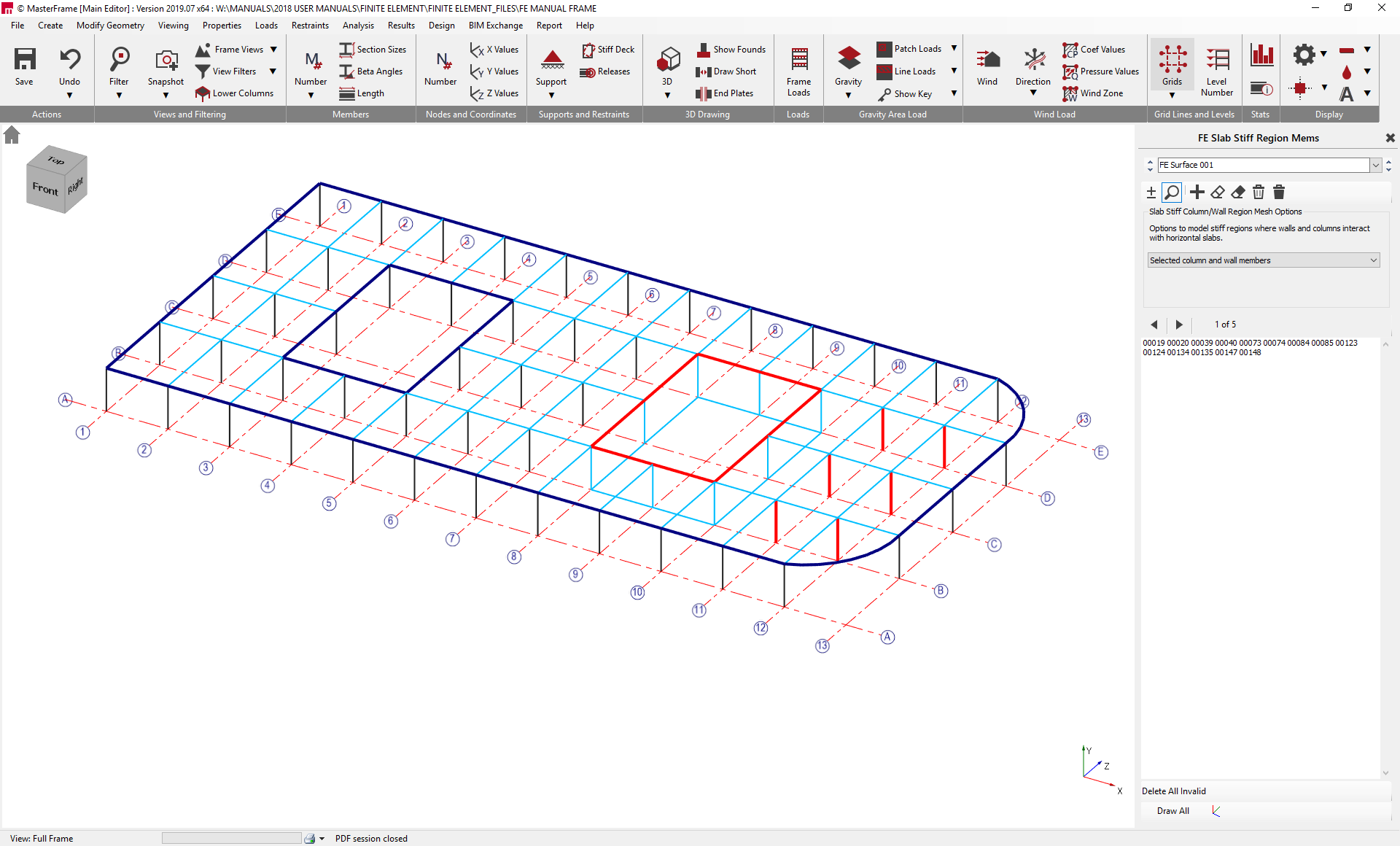 A typical layout of the screen is shown below. Here, a stiff region has been applied to wall around the void in the slab, along with a number of columns. The selected members are shown in red.