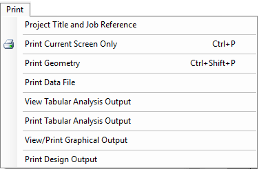 The print menu contains options to both print out a range of outputs including the design checks for any brief appended to a member, to print the frame geometry view from the graphics pane and also to set up the Project title and Job Reference which are used in the title page of the calculations.