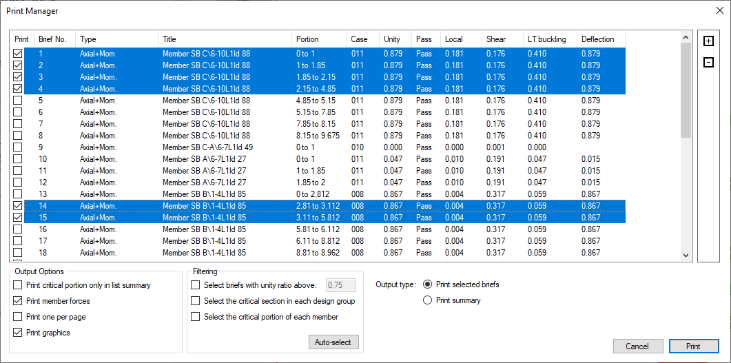 On selecting the Print Design Output option, the screen layout is as shown below. The bottom pane now shows a list of the steel design briefs in the whole model, along with a range of brief selection and print options.