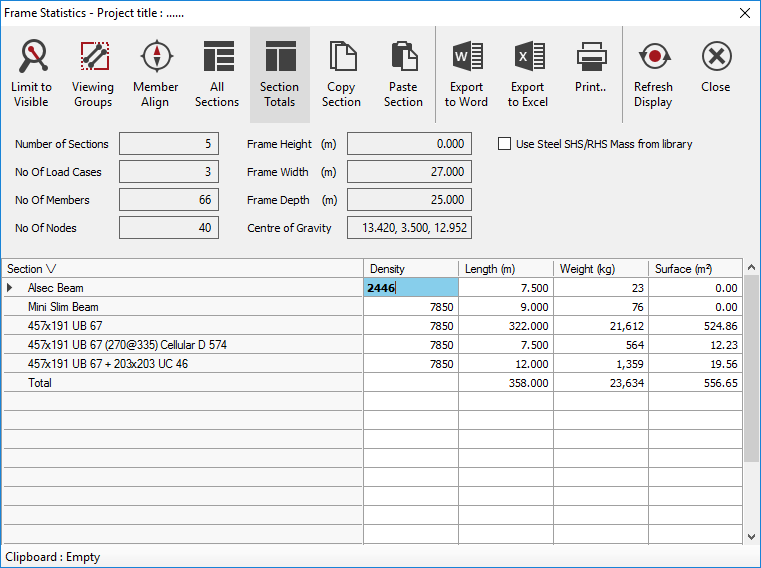 The Frame Section Property Statistics enables you to view statistical information on your frame, including the estimated frame weight. The information should not be used as a cutting list. The lengths shown are based on the member centrelines in the model.