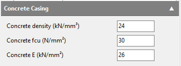 The member concrete casing properties are selected from the Properties menu. Again, this takes you into the Global Data side panel where the concrete density, strength and E value can be defined as global values. These will be applied to any steel beam or column members on which concrete encasement has been defined in the Member Sections area.