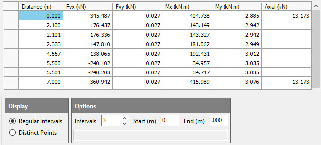 The above member is set for forces at 3 intervals (4 values). However, MasterFrame also gives values each side of each external load. Thus, we have values at 2.1 m and 2.101 m.