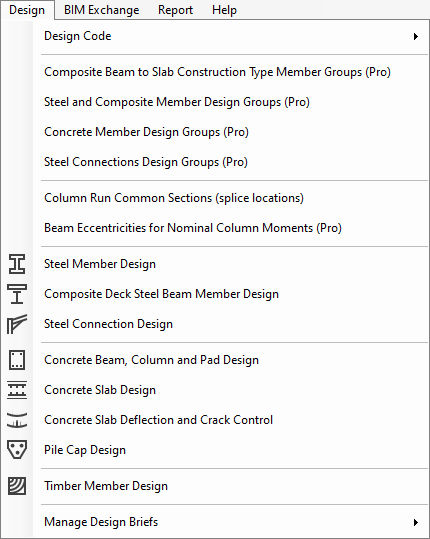 Design modules include steel member design, composite deck steel beam member design, steel connection design, concrete beam, column and pad design, concrete slab design, concrete slab deflection and crack control, pile cap design and timber member design.