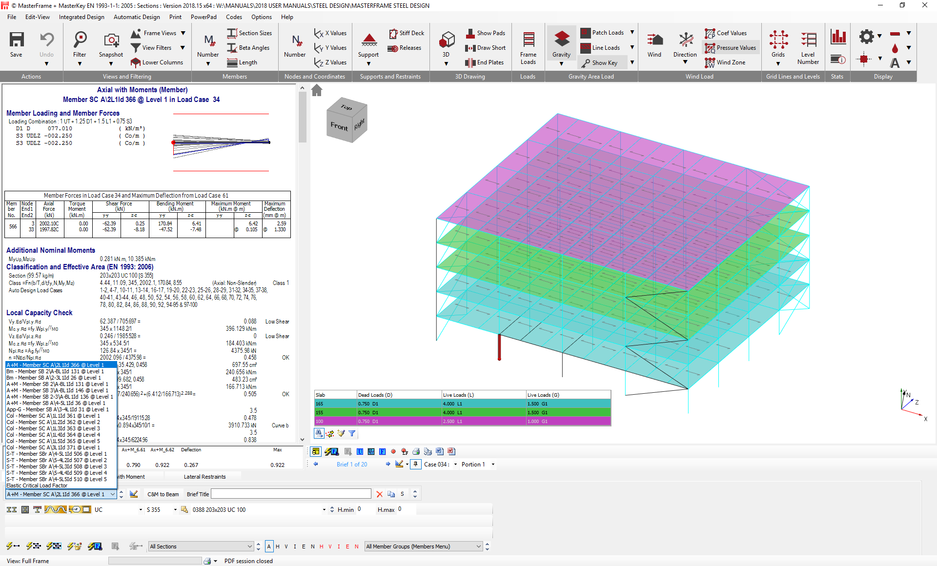 On larger models, it may be time consuming to use the sort buttons to find the brief on any particular member, or it may be difficult to know which member a brief title is referring to. Therefore, it is also possible to display the design brief for a member by selecting the member itself in the graphics window. This can be done using the mouse cursor; move the mouse cursor over the member and left-click. To assist with locating a member in a model, the graphics navigation tools of Masterframe can be used to filter the view in the graphics window. Alternatively, if member viewing groups have been created within Masterframe, these groups can also be selected using the .png)