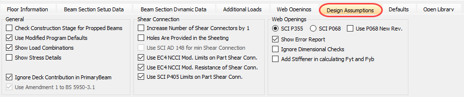 There are 3 sections to these design assumptions - General, Shear Connection and Web Openings.