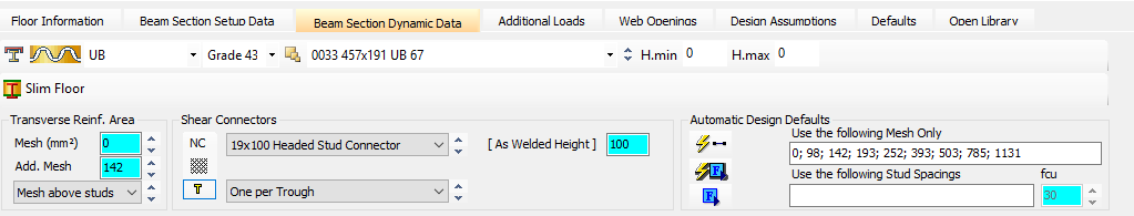 The steel section size and grade are selected from the droplists. A minimum (H.min) and maximum (H.max) depth of section can be set so the droplist only includes sections within these parameters. This can be of benefit when there are floor depth restrictions applicable in the design criteria.