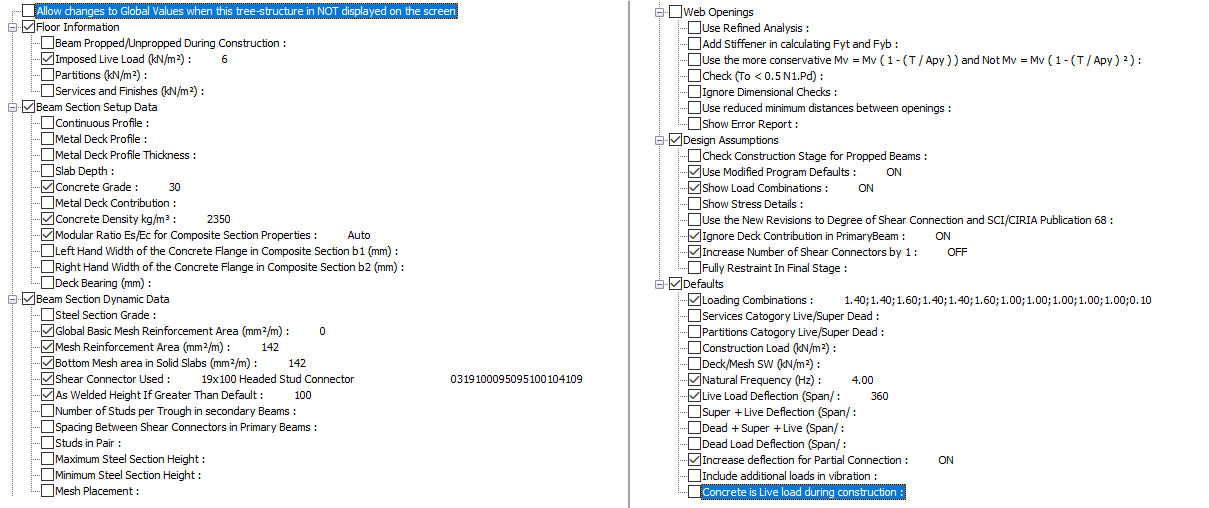 The Global Editing mode allows you to set one or more parameters as global values, applicable to all design briefs in your current composite beam design file. These values will be set as the same for each beam design in the file. For example, you may wish all the beams to have a concrete grade of 30 N/mm2 or a minimum mesh reinforcement of 142mm2. This saves you having to alter the value for each individual design brief in the file.