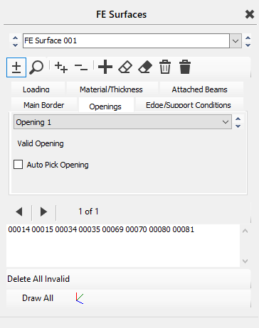 An opening can be added by either selecting the individual members which make up the opening boundary, or by picking a point within a "panel" using the "Auto Pick Opening" option. The opening number is selected from the drop down in the right hand pane.