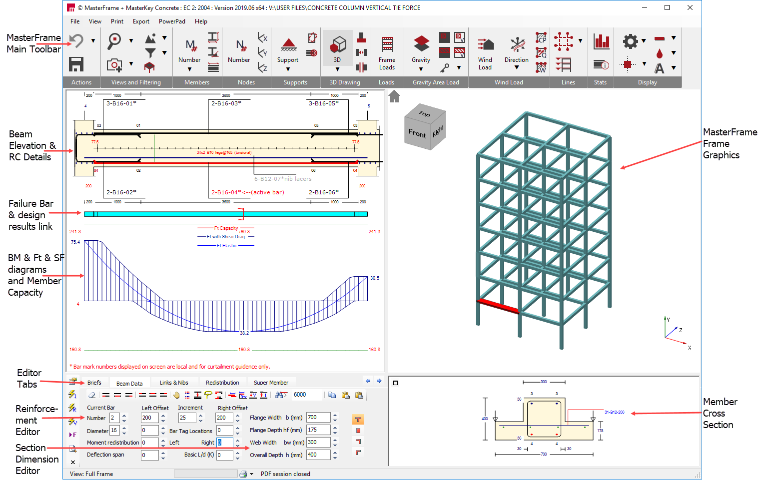 Note: When designing in BS code the bending moment (BM) diagram is displayed. In EC design the diagram shows the tension force (Ft) in the reinforcement bars.