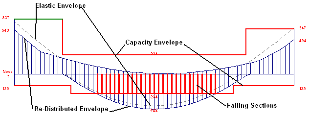 Displays the applied BM/Ft/SF diagram together with the capacity diagram. Any failures are shown as vertical red lines. The number of design increments along the length of the beam (vertical blue lines) can be changed in the Display and Print sub menu for beams in the Basic Data and Defaults.