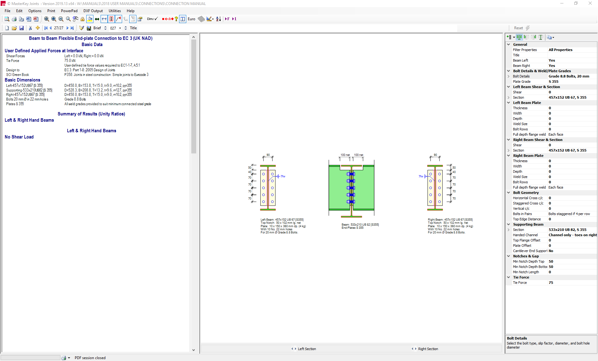 The default set layout is for a beam on the left and right of the supporting beam, with partial depth end plates The initial shear force values are set at zero. The default screen layout is shown below.