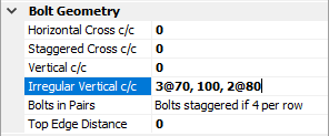 Horizontal Cross c/c - shows the current set bolt horizontal centre-to-centre dimension. This input is used for the inner bolts when staggered or 4 bolts per row are defined