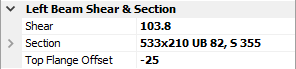 Where a left hand beam has been set in the General area of the property grid, the left beam properties are displayed in the main property grid under the Left Beam Shear & Section area. This area also allows the shear force on the left beam connection to be defined. The default layout of this area is shown below.