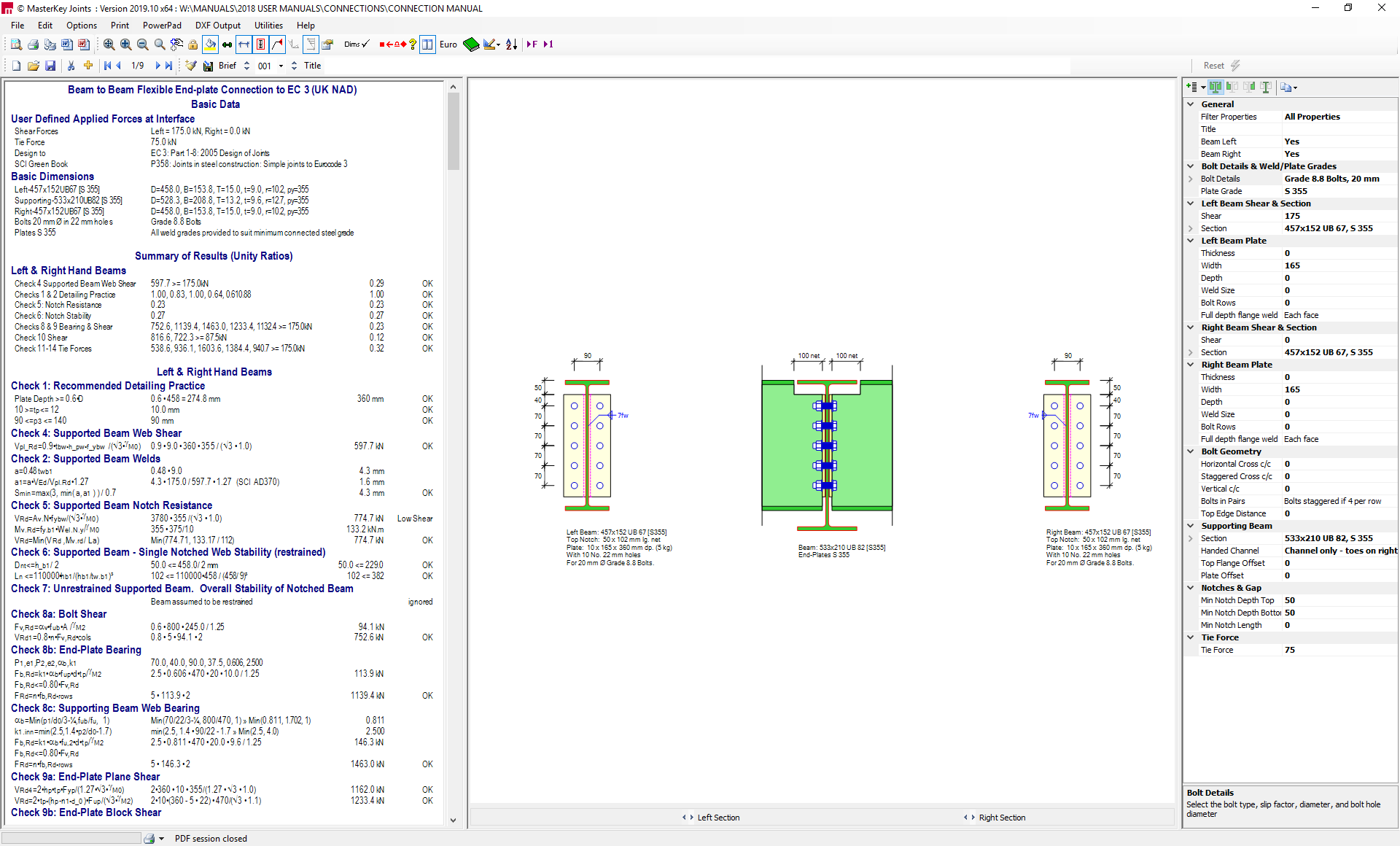 The left hand pane displays the connection design information. The calculations are updated dynamically as the connection design information is changed in the right hand pane. The displayed calculation information represents the relevant design checks for the calculation type taken form the SCI Green Books. When all the design checks are deemed to pass, the calculation pane will have a white background. Should any design check fail, then the calculation pane will have a cyan background and a warning note will display, indicating which design checks are not currently passing.