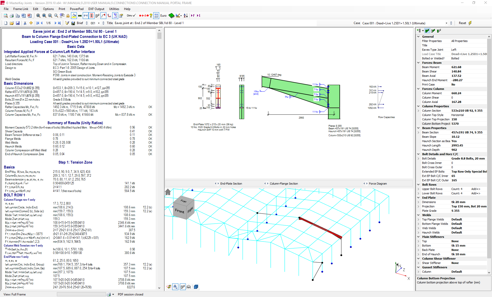 The MasterKey:Simple and MasterKey:Moment connection modules can be used as either standalone modules, whereby the connection types, geometry and forces are input manually, or linked, integrated designers, such that the connection type, geometry and forces are taken from the Masterframe model. The basic operation of the software remains the same for both modes of operation, but there are some differences in the screen layouts, to reflect whether or not there is a linked Masterframe model. In a linked connection design, the Masterframe model will be displayed in one of the panes. The linked connection design will also have some differences in the menu options.