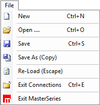 Exits the Masterseries software as well as the connection module. If changes have been made to the file since the last save, the software will ask if the Connection file is to be saved or not prior to exiting the software.