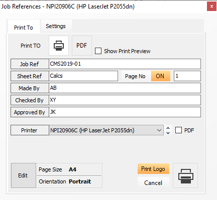 icon has been selected the print manager screen will open. The provides options for selecting whether to print to a printer or to print to a pdf. There are also option to control both the page size and orientation. Additionally, the project references can be entered, if they have not been done so previously, or amended. The layout of the print manager window is shown below.