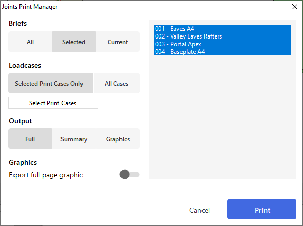 Alternatively, click on the 'Select Print Cases' button to open the screen below where you can select which particular briefs and loadcases to print/export.
