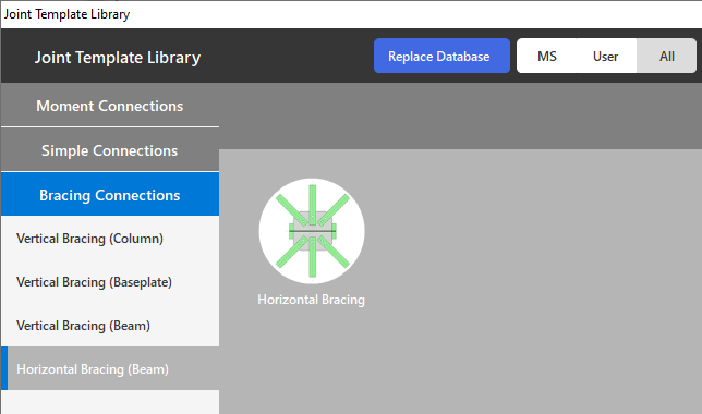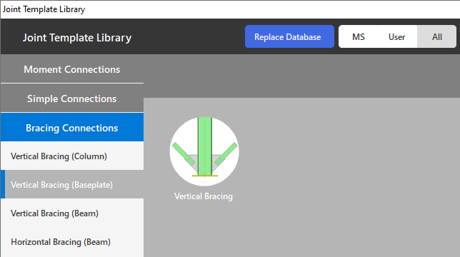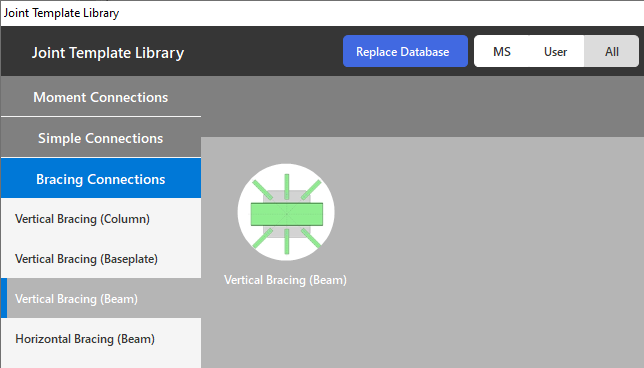 When you click on the +Add button in the Briefs section of the top toolbar to add a another connection to your file, the Joint Template Library will open up, from which you can select moment, simple or bracing initial connection layouts.