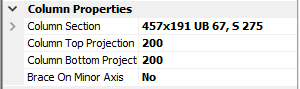 The column properties area allows the column section and grade to be defined. The column properties area also allows the column orientation to be defined to control whether the bracing members connect to the column about the major or minor axis. The layout of the Column Properties area is shown below.