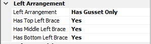 The default setting is for a gusset only bracing connection with all three bracing members present. To change the bracing arrangement, the Left Arrangement row is selected and the drop down list is used to modify the arrangement. The three arrangement types available are