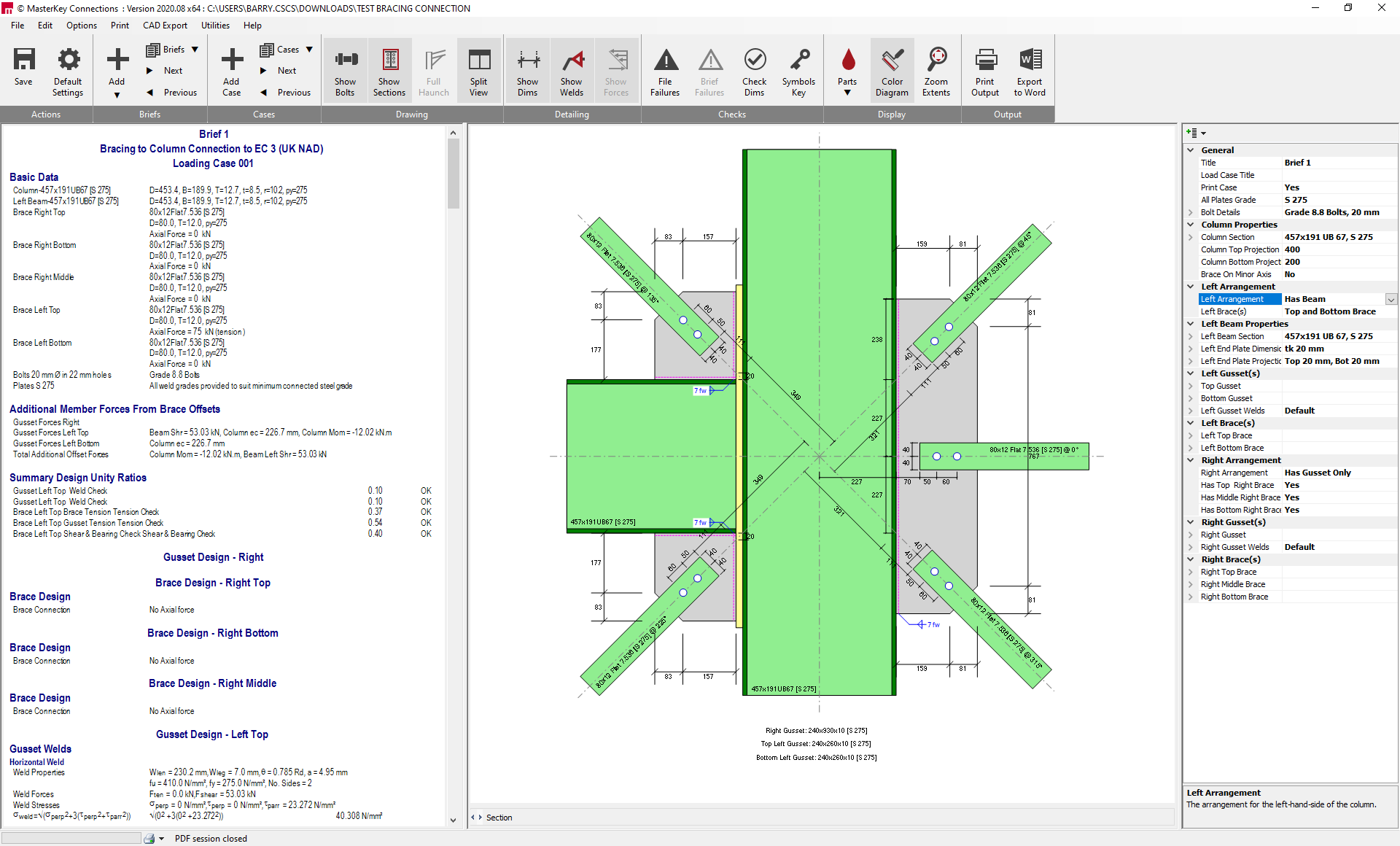 The connection design is limited to the bracing elements, gusset plates and welds. The column section is not checked as part of the bracing connection design and will need to be assessed independently of the bracing connection design.