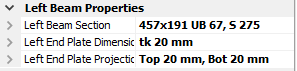 When the left bracing arrangement has been set to include a left beam, the Left Beam Properties area will be included in the right hand pane. This allows for the definition of the beam section and endplate dimensions. The default Left Beam Properties area is shown below.