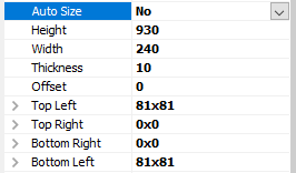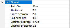 The Auto size option uses the input minimum distances such as the bolt edge distance or the bolt geometry along with the brace setting out point and any horizontal or vertical offsets (see the Left Brace input area) to determine the geometry of the gusset plate. The size and shape of the gusset can be amended by turning off the Auto Size option. Doing so will provide the user with additional inputs. The Auto Size option can be turned off by selecting the Auto Size row and then using the drop down option to select 'No'. Once set to No, this input area modifies to provide input to determine the size of the gusset and chamfers. This modified area is shown below.