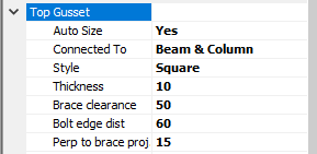 Edge distance - displays the current edge spacing for bolts. An input of zero means the bolts will be aligned on the brace centreline when there is a single bolt per column