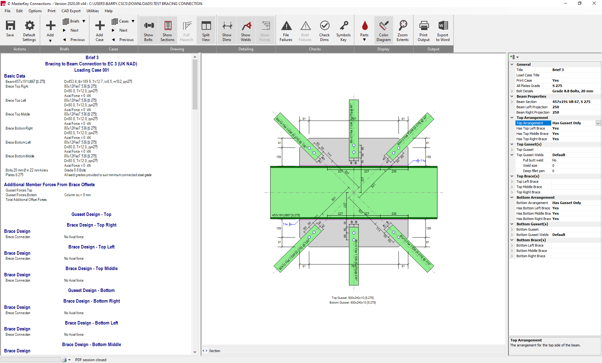 When the 'Has Column' option is selected the input options in the Top Arrangement area change to reflect the options available for this bracing arrangement. The graphics display of the connection will also update to include a horizontal beam. In addition, a Top Column input area will also be added to the right hand property grid pane to allow the definition of the column and end plate. The modified screen layout is shown below.