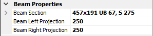 The beam properties area allows the beam section and grade to be defined. The layout of the Beam Properties area is shown below.
