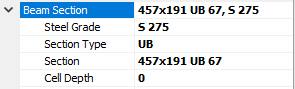 Each property can be amended by selecting each row. For the Steel Grade, Section Type and Section rows, this will activate a drop down indicator, which can be selected to expand the drop down to allow the required property to be selected. The cell depth input controls the beam depth for castellated or cellular beams. Using the mouse pointer, clicking in the right hand part of this row will allow the cellular beam depth by be manually input.