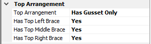 The default setting is for a gusset only bracing connection with all three bracing members present. To change the bracing arrangement, the Top Arrangement row is selected and the drop down list is used to modify the arrangement. The three arrangement types available are