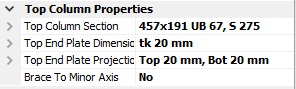 When the top bracing arrangement has been set to include an upper column, the Top Column Properties area will be included in the right hand pane. This allows for the definition of the column section and endplate dimensions. The default Top Column Properties area is shown below.