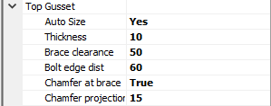 The Auto size option uses the input minimum distances such as the bolt edge distance or the bolt geometry along with the brace setting out point and any horizontal or vertical offsets (see the Top Brace input area) to determine the geometry of the gusset plate. The size and shape of the gusset can be amended by turning off the Auto Size option. Doing so will provide the user with additional inputs. The Auto Size option can be turned off by selecting the Auto Size row and then using the drop down option to select 'No'. Once set to No, this input area modifies to provide input to determine the size of the gusset and chamfers. This modified area is shown below.
