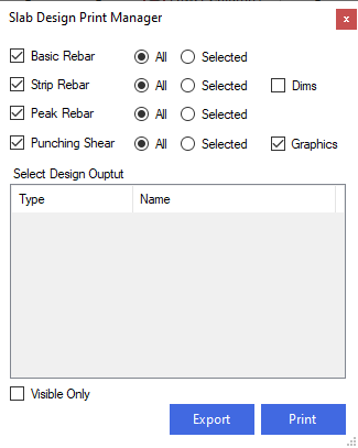 The design for the various reinforcements zones can be selected for printing by using the check boxes to the left of the window. To print all the designs for a zone, check the All radio button. To select specific designs, the radio button for Selected should be used. This will then populate the Select Deign Output window with the names of each design brief for the Selected rebar regions. A design is selected for printing or exporting by clicking on the line in the Select Design Output using the left mouse button while holding Ctrl. Each selected design output will highlight in blue.