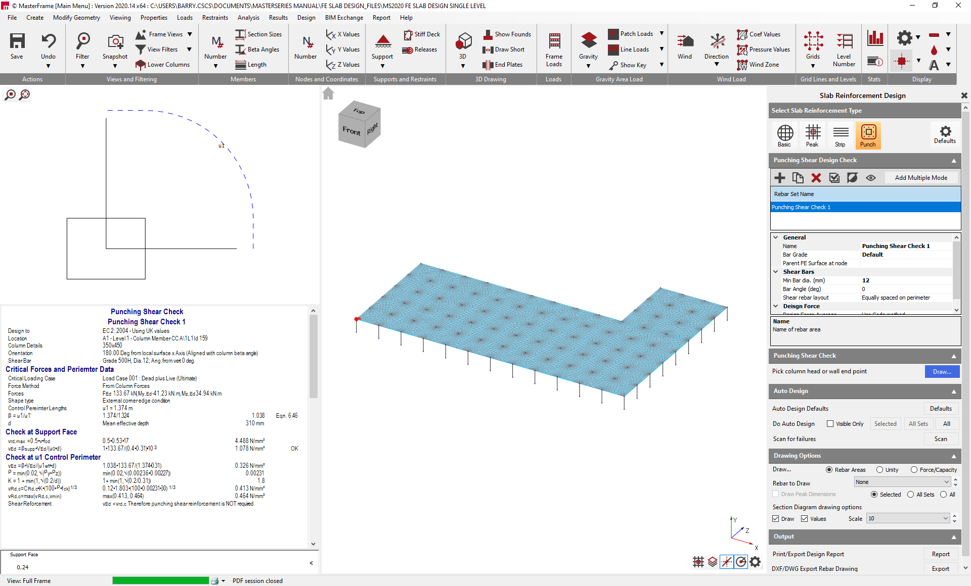 The Punching menu provides tools to carry out punching shear checks at specified locations in the slab and to automatically design any punching shear reinforcement that is required. Punching shear checks are intended for use at the interface of columns and slabs, either where columns are providing support to the slab or in the case of transfer structures where the column is supported by the slab. Punching shear checks can also be applied to the ends of walls.