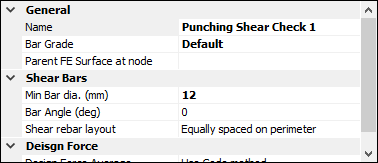 The Punching Shear properties area contains inputs to control how the punching shear perimeters are defined, definitions for the shear reinforcement placement and controls for how the design forces are derived.