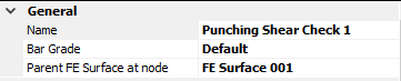The General input provides inputs to amend the name of the punching shear design check, and also provides controls over the reinforcement grade and the FE surface the punching shear check is associated with in the case that the perimeters cross the boundary between multiple FE surfaces.