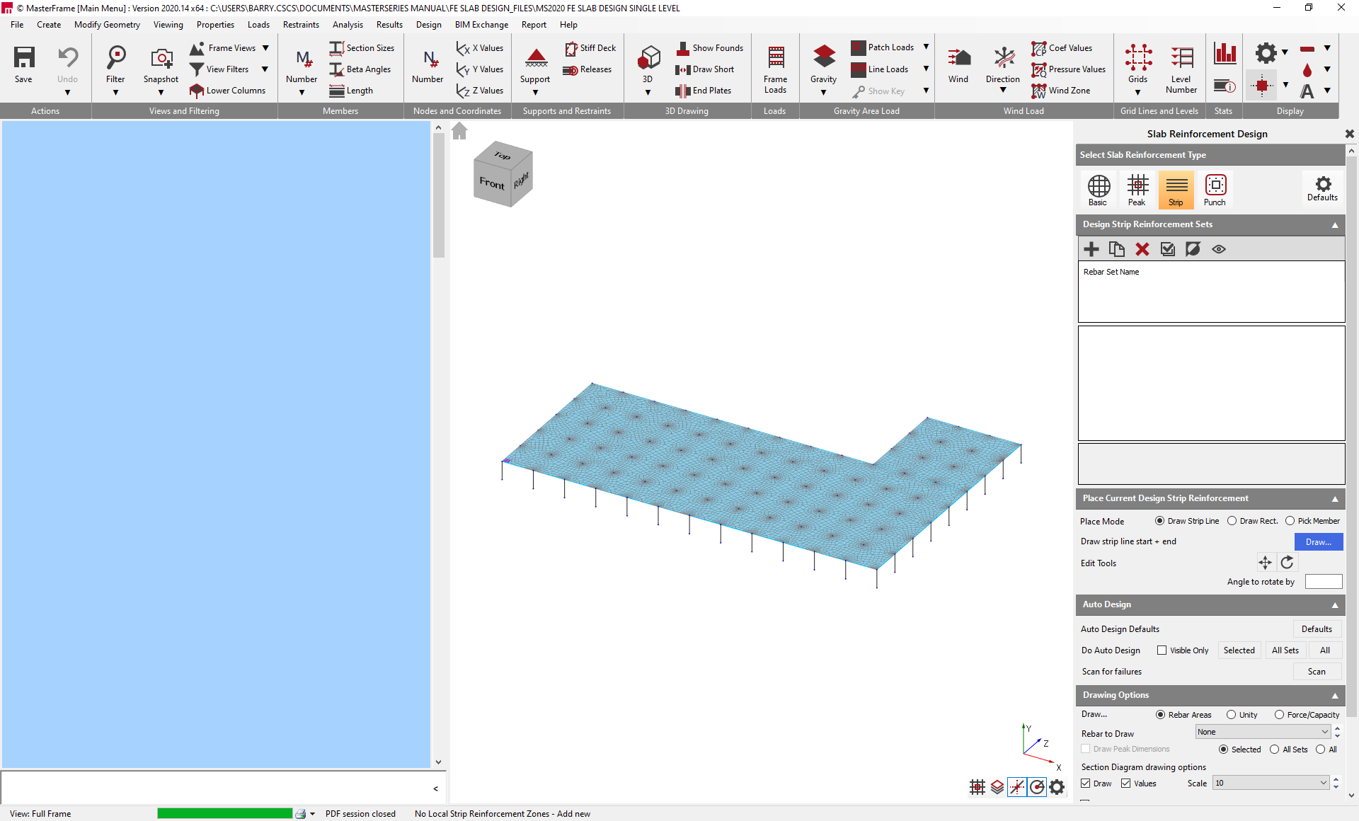 Strip Zones are intended to provide additional or increased reinforcement in a single direction. An example would be the provision of additional reinforcement to deal with the sagging moments found in column strips in the slab. Strip zones are created by selecting lines which define the position and orientation of the strip zone of reinforcement