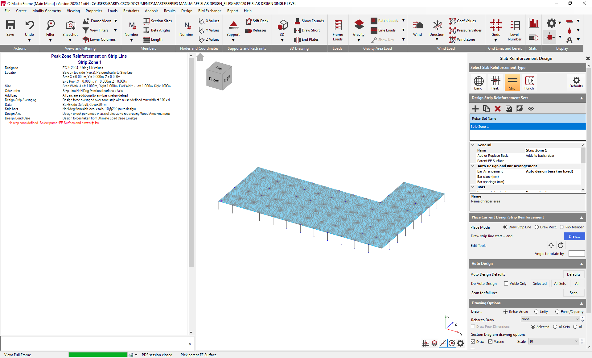 The left hand pane displays the design calculations. The central pane displays the graphics view of the model. The graphics windows can be controlled by the menus as in Masterframe. The right hand pane contains the controls for adding Strip zone, defining the design parameters for the Peak zones, carrying out the autodesign and displaying a range of results to assist in investigating the design.