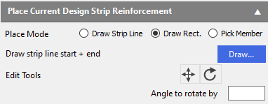 Strips are created graphically in the graphics window. Strips can be created by either drawing the centreline of the strip and then defining the widths of the strip at the ends, by drawing a rectangle by selecting points on the FE surface by selecting points that represent opposite corners of the strip, or by using a member within the FE surface to define the centreline of the strip - the selected member does not have to be an attached beam so FE Dummy Members can be used for this purpose. The placement method is selected in the Place Current Design Strip Reinforcement area.