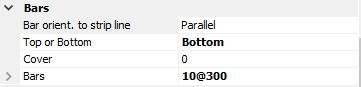 The Bars input area controls the reinforcement positioning and orientation in the currently selected strip zone. Since strip ones only contain reinforcement in either the top or bottom of the slab and either perpendicular or parallel to the strip axis, the inputs have only a single input for the reinforcement bars. The layout of the Bars area is shown below.