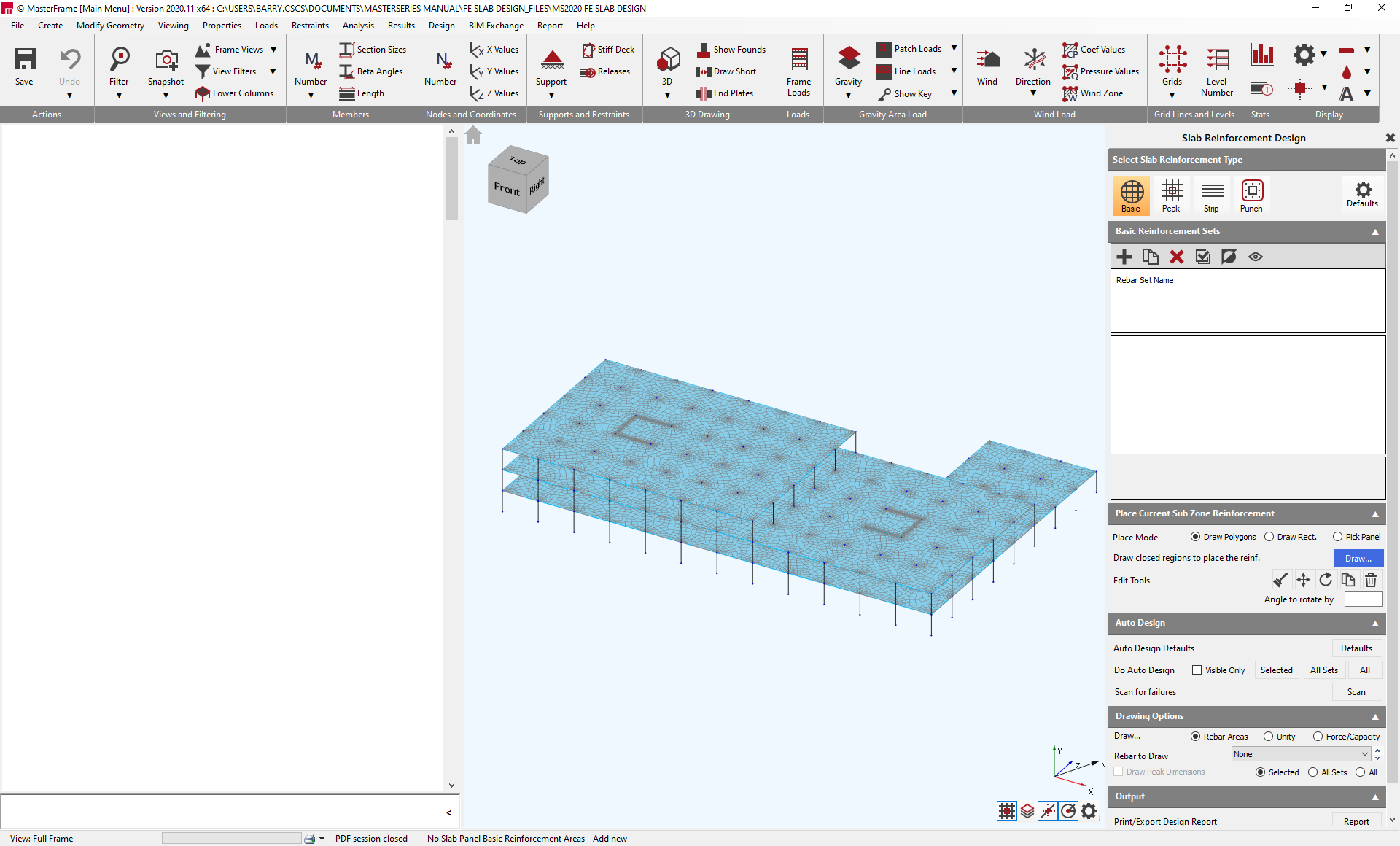 The Basic Region reinforcement is intended to provide a general reinforcement in the T1, T2, B1 and B2 layers of an area of slab to cover the general reinforcement design within that region. Basic regions can be defined to apply to specific FE surfaces or, alternatively, applied within drawn zones or regions. Drawn regions can be part of an FE surface or may run across the boundary of adjacent FE surfaces. Basic regions must be flat (planar) regions.