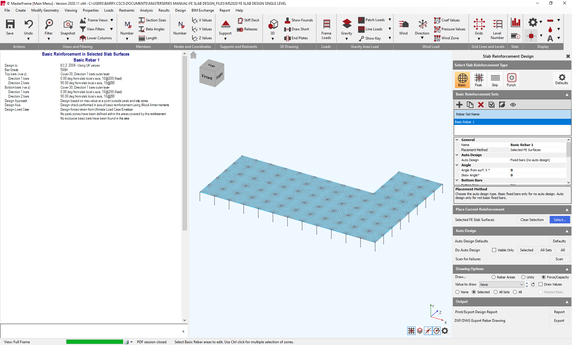 It is possible to overlap drawn regions and regions applied to FE surfaces. In this instance the Basic Rebar applied to the FE surface will apply to those areas of the FE surface not also defined in a drawn region.