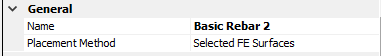 The General input allows the basic rebar area to be named. Each created basic rebar area is given a default name. The General area also allows the placement method to be selected. Each basic rebar set can be set to apply to a whole FE surface or to a drawn region within a plane. The default option for the placement method is 'Selected FE surfaces'/ The default layout is shown below.