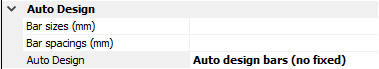 The bar sizes and spacings are defined in the Defaults area. However, by adding bar and spacings dimensions in the Bars Sizes and Bar Spacings row, it is possible to control the allow bar arrangement and sizes for use with the auto design. Multiple bar sizes and.or spacings can be input by separating the required dimensions, separated by commas.